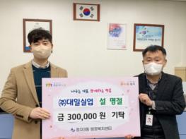 수원시 장안구 정자3동은 지난 26일, ㈜대일실업에서 저소득 가구에 전달해 달라며 성금 30만원을 기탁했다고 밝혔다.㈜대일실업 김진수 대표는 “코로나19로 인해 힘든 시기를 보내고 있을 주변 이웃들이
