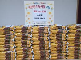 수원 수병원은 지난 20일 관내 어려운 이웃들을 위해 쌀 50포(10Kg)를 우만1동 행정복지센터에 전달했다. 김준용 병원장은 “설명절을 맞이하여 도움이 필요한 이웃들에게 잘 전달되길 바라며, 모두가 어려