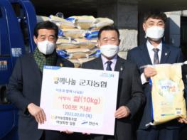 안산시는 3일 군자농협(조합장 조인선) 여성회로부터 관내 어려운 이웃을 위한 사랑의 쌀 100포(10㎏)를 기탁 받았다.이날 안산시청에서 열린 전달식은 윤화섭 시장과 김근창 NH농협?안산시지부장, 조인선