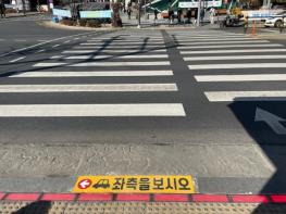 과천시가 횡단보도 교통사고 예방을 위해 보행자의 주의를 환기시키는 문구를 바닥에 표시해 눈길을 끈다. 시는 어린이보호구역과 보행자 통행이 많은 횡단보도 14개소의 대기 구간에 ‘양옆을 살펴요’,