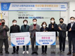 광명시는 지난 17일 시청 중회의실에서 사회적경제 제품 공공기관 우선구매 촉진과 사회책임 조달을 모범적으로 수행한 우수부서 포상을 실시했다.시는 행정기관, 행정복지센터, 시의회사무국을 대상으로 작