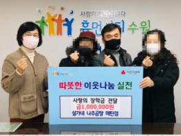 수원시 영통구 매탄1동 소재 설가네 나주곰탕(대표 설명환)은 지난 18일, 관내 저소득 가정에 장학금 100만원을 후원했다.장학금은 부모의 지원을 받기 어려워 조부모와 생활하는 가정위탁 2가정에 전달하여