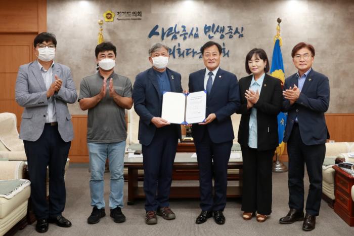![]() [뉴스시선집중 박광옥 기자] 경기도의회(의장 장현국)가 27일 정전협정 67주년을 기념해 남북화합을 상징하는 ‘한반도기’를 게양했다. 이번 한반도기 게양은 시민사회단체 ‘개성공단·금강산관광 재개 범국민운동 경기도본부’의 제안에 따른 것으로, 의회는 이날부터 8월15일 광복절까지 20일 간 한반도기를 걸고 평화통일에 대한 의지를 표명할 예정이다. 장현국 의장은 이날 오후 의장 접견실에서 범국민운동 경기도본부 이종철 상임공동대표, 박성철 공동집행위원장, 박영봉 사무처장을 만나 접견한 뒤 명예대표직을 수락했다. 이어 의회 국기게양대 앞에서 한반도기 게양식을 실시했다. 접견 및 게양식에는 범국민운동 경기도본부 고문을 맡고 있는 정희시 의원과 정윤경 교육기획위원회 위원장이 함께 참석했다. 장현국 의장은 “제10대 의회 전반기 동안 ‘평화경제특별위원회 위원장’을 역임하며 남북교류협력사업 확대를 위해 전방위적으로 노력했지만, 남북관계 경색으로 여러 사업이 좌초돼 아쉬움이 컸다”면서 “한반도 평화분위기 조성에 적극 협력하고 나아가 남북관계 개선과 교류협력 확대에 일조할 수 있도록 노력하겠다”고 말했다. 개성공단·금강산관광 재개 범국민운동 경기도본부는 한반도 평화·번영을 앞당기기 위한 활동을 펼치고자 지난해 10월23일 결성된 시민사회단체 모임으로, 지난 2월27일 기준 61개 단체가 참여하고 있다. 경기도의회 송한준 의원이 제10대 의회 전반기 의장 재직당시 명예대표직을 역임했으며, 현재 이재정 경기도교육감과 이재강 경기도 평화부지사가 공동 명예대표를 맡고 있다. |