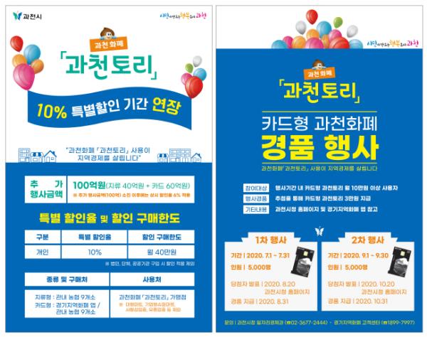 한편, 시는 과천화폐 이용 활성화와 지역 소비 촉진을 위해 7월과 9월에 카드형 과천토리를 각각 10만원 이상 사용한 사람을 대상으로, 총 1만 명을 추첨하여 경품으로 카드형 과천토리 3만원을 지급하는 경품 행사도 실시하고 있다.