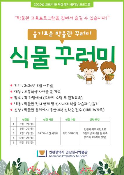 인천광역시(박남춘 시장) 검단선사박물관은 코로나19 확산 방지를 위해 지난 6월 시범운영한 『슬기로운 박물관 꾸러미』 홈러닝 프로그램을 2020년 여름방학 및 하반기 주말에도 운영한다.