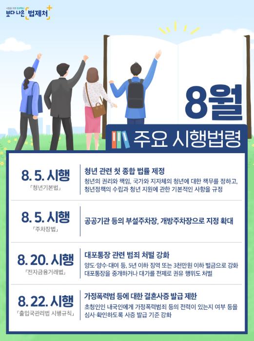 법제처(처장 김형연)는 8월에 총 108개의 법령이 새로 시행된다고 밝혔다. 주요 시행법령의 내용과 시행일은 다음과 같다.