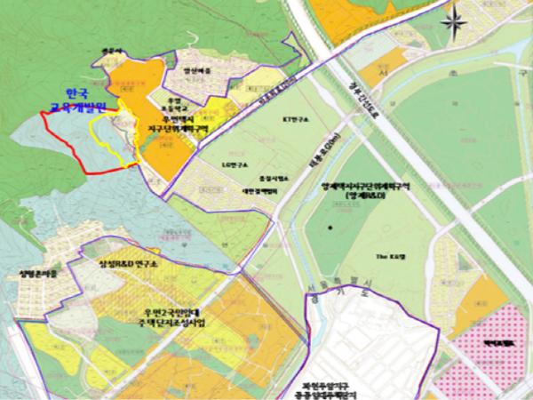 해당 부지는 도시계획 상 약 78%정도가 개발제한구역(그린벨트)으로 지정돼있는 땅으로, 그린벨트 일부분에 콘크리트 건축물이 44년간 입지하여 2017년까지 한국교육개발원이 사용해 오다, 「혁신도시 조성 및 발전에 관한 특별법」에 따라 2017년 충북 진천으로 이전하였고, 현재 3년째 공실상태이다.