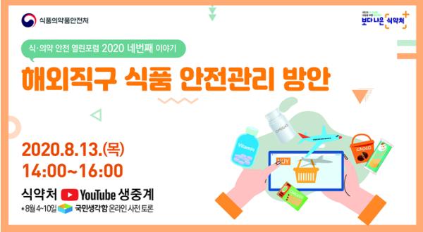 식품의약품안전처(처장 이의경)는 오는 13일 소비자단체?학계?업계와 함께 ‘해외직구 식품 안전관리 방안’을 주제로 비대면 방식의 온라인 포럼 ‘제4회 식?의약 안전 열린포럼 2020’을 개최한다고 밝혔습니다.