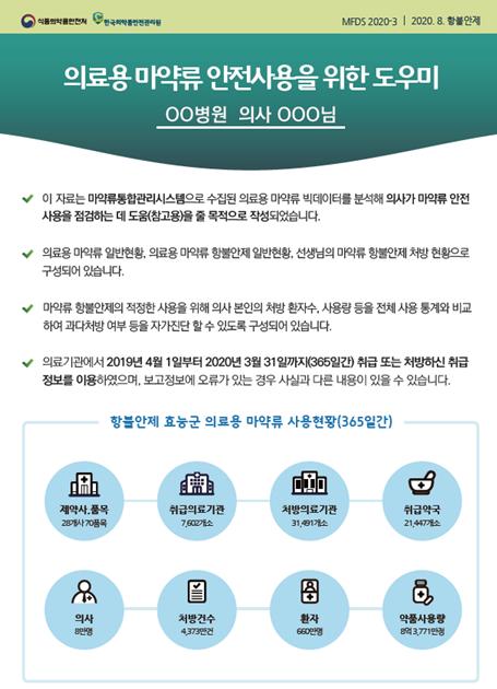 이번 도우미 서한은 마약류 항불안제의 적정한 사용을 위해 의사 본인의 처방 환자수, 사용량 등을 전체 사용통계와 비교하여 과다처방 여부 등을 자가진단 할 수 있도록 구성하였으며,