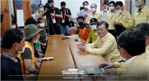 먼저 대통령은 구례군 5일시장 입구에 위치한 현장 지휘본부에서 피해 상황을 보고받았습니다. 임국환 구례읍장은 "군·경의 헌신적인 노력으로 인명피해는 없었다"면서도, 다만 "20개 마을에서 현재 1,318명의 이재민이 발생해 분산 보호 조치했다"고 설명했다. 이어 김순호 구례군수는 "침수로 인해 기자재, 물품, 이불, 옷가지 등 하나도 건질 수가 없었다"며 어려움을 호소하기도 했다.