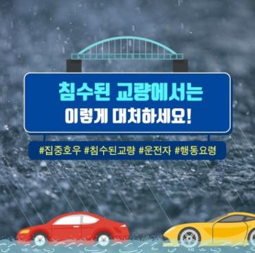 많은 비가 올 때 하천 주변은 피하고 차량 탈출요령 꼭 기억하세요!