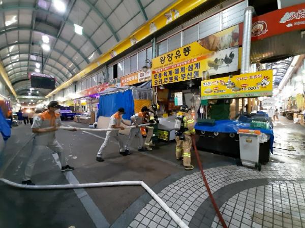 주요 훈련 내용으로는 ▲소방 활동 장애요인 제거 ▲시장 내 소방시설을 활용한 초기 진압 및 연소 확대 저지 ▲인명구조 및 검색 등으로 이뤄졌다.