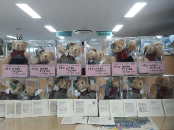 지난 14일 오후, 죽산중학교 박진서 선생님과 학생들은 안성시 보건소를 방문하여, 감사인사와 노래를 담은 곰돌이 녹음 인형과 직접 만든 쿠키, 감사와 격려의 메시지를 적은 그림엽서를 전달하여 무더운 여름날 근무자들의 마음을 흐뭇하게 해주었다.