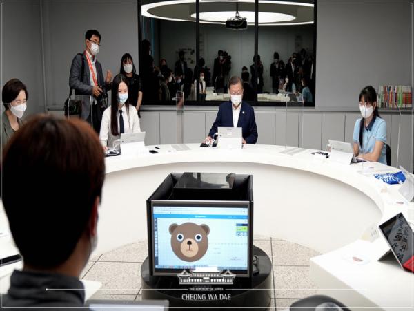 대통령은 학생들 모두에게 디바이스가 배분되는지, 과목 별로 적용되는 정도가 어떤지 등을 물었고, 정소영 테크매니저는 "수업받는 학생 모두에게 태블릿PC 등이 지급되고, 과목마다 적용되는 프로그램이 다르다"고 설명했다.