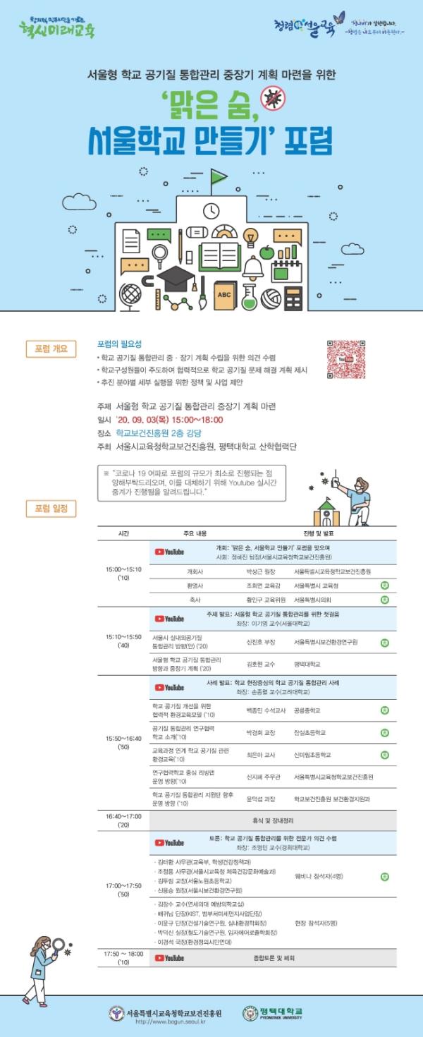 서울특별시교육청(교육감 조희연) 산하 학교보건진흥원(원장 박상근)은 9월 3일(목) 오후 3시 학교보건진흥원 2층 강당에서 서울형 학교 공기질 통합관리 중장기 계획 마련을 위한 ‘맑은 숨, 서울학교 만들기' 포럼을 개최한다.