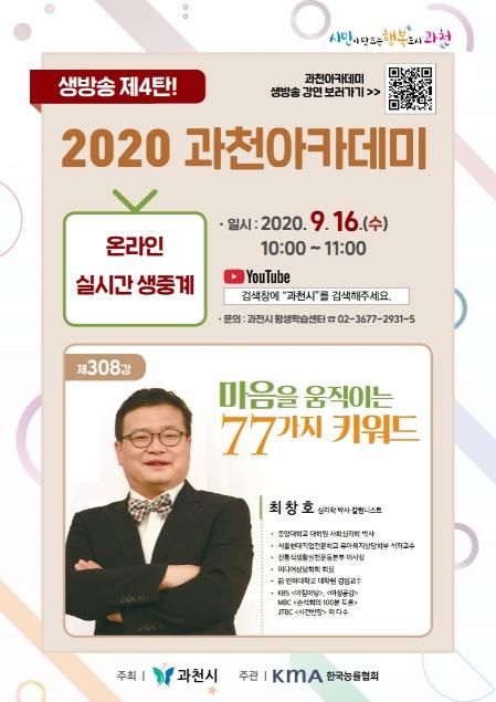 [뉴스시선집중, 김강산기자] 과천시는 오는 16일 과천아카데미 제308강 강연을 오전 10시부터 한 시간 동안 유튜브로 생방송한다. 이번에는 최창호 교수(중앙대학교 대학원, 사회심리학 박사)를 초청해 ‘마음을 움직이는 77가지 키워드’를 주제로 강연을 실시한다.