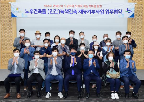 8개 시공사는 16일 오후 3시 시청 중회의실에서 ‘녹색건축재능기부사업(2차)’ 신청자들과 개별적인 업무 협약을 체결했다. 협약식은 코로나19 방역 수칙을 준수하며 간소하게 진행됐다.