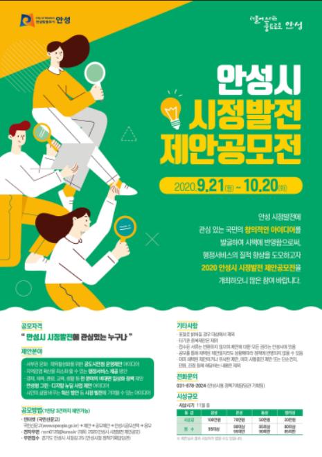 공모주제는 서부권 문화체육 활성화를 위한 공도시민청 운영제안 아이디어, 지역감염 확산을 최소화 할 수 있는 행정서비스 제공방안, 경제·체육·관광·교육·생활 등 전 분야의 비대면 일상화 정책제안, 안성형 그린·디지털 뉴딜 사업제안 아이디어, 시민의 삶을 바꾸는 혁신 방안 등 시정발전에 기여 할 수 있는 아이디어 총 5개로 코로나 19시대에 변화 대응 시책과 정부정책에 대한 아이디어를 통해 시정발전을 위한 방안을 모색하고자 한다.