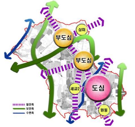 또한, 개발축과 보전축을 설정하여 개발축 별 핵심기능을 부여하고 기능강화를 위한 전략을 제시하였다.