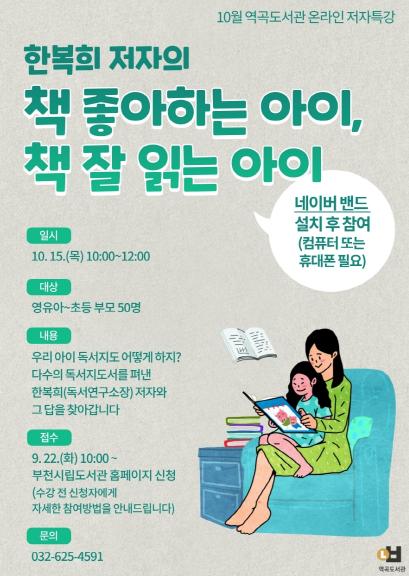 영유아 및 초등학생 부모를 대상으로 한 이번 특강은 “책 좋아하는 아이, 책 잘 읽는 아이”라는 주제로 10월 15일 진행된다.