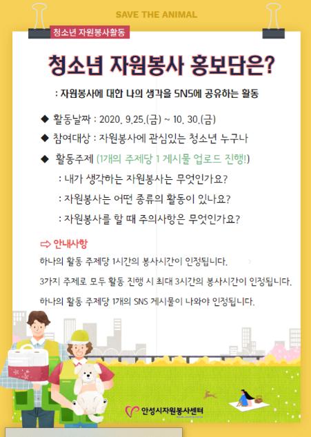 [뉴스시선집중, 박광옥기자] 안성시자원봉사센터는 9월 25일부터 10월 30일까지 ‘청소년 자원봉사 홍보단’을 운영할 예정이다.