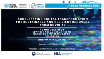[뉴스시선집중, 조선호기자] 행정안전부가 유엔 경제사회처(UN DESA)와 한국정보화진흥원과 함께 ‘코로나19 극복을 위한 디지털전환 역량계발 화상회의’를 10월 13일에 개최한다.