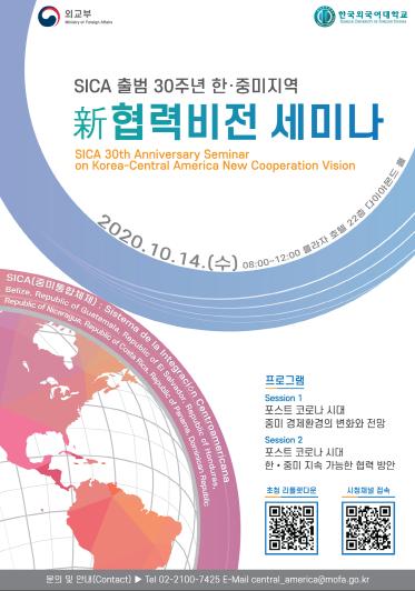 내년 중미국가 독립 200주년 및 중미통합체제(SICA) 출범 30주년 등 역사적 계기를 앞두고 개최되는 이번 세미나는 중미지역 국가(SICA)와의 전략적 실질협력 증진을 위해 최초로 중미국가들과 개최되는 세미나로서, 한-중미간 미래협력 비전을 제시하고, 코로나19 이후 K-방역, 한국판 뉴딜을 활용한 포스트코로나 對중미 인프라 사업 진출 등 실질협력 방안을 구체적으로 논의하는 자리가 될 것이다.