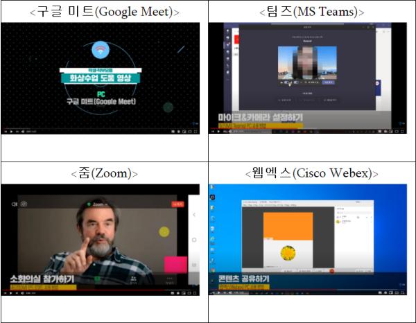 학교 현장에서 가장 많이 사용하는 화상수업 도구 5종인 구글 미트(Google Meet), 팀즈(MS Teams), 줌(Zoom), 웹엑스(Cisco Webex), 구루미(Gooroomee)를 활용하는 내용으로, 개인용컴퓨터(PC), 모바일(안드로이드), 모바일(iOS) 기반 도움 영상을 개별 제작하여 총 15종의 영상 자료를 제공한다. 화상수업 도움 영상은 서울시교육청 유튜브 채널(서울형 온라인교실(초등 및 유치원))에 탑재되어, 도움이 필요한 학생과 학부모는 누구나 이용할 수 있다.