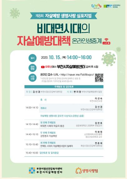 [뉴스시선집중, 박동혁기자] 부천시는 오는 10월 15일 ‘비대면 시대의 자살예방 대책’이라는 주제로 생명사랑 심포지엄을 온라인 생중계할 예정이다.