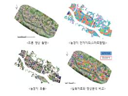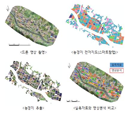 드론 영상 분석은 드론으로 면 단위의 넓은 지역(4,000ha)을 촬영한 뒤 영상에서 농경지 전자지도(스마트팜 맵)를 이용해 농경지만 추출하고, 식생지수(NDVI)와 인공지능(머신러닝)을 통한 분석으로 총 재배 면적을 파악하는 기술이다.
