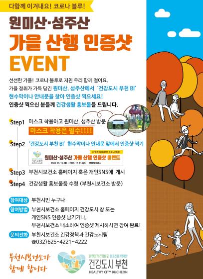 부천시민이면 누구나 이벤트에 참여할 수 있다. 참여할 시민은 마스크를 착용하고 단풍이 예쁘게 물든 원미산 정상과 성주산 전망의 숲에 걸린 ‘건강도시 부천 BI’ 현수막이나 안내문 앞에서 인증사진을 찍으면 된다.