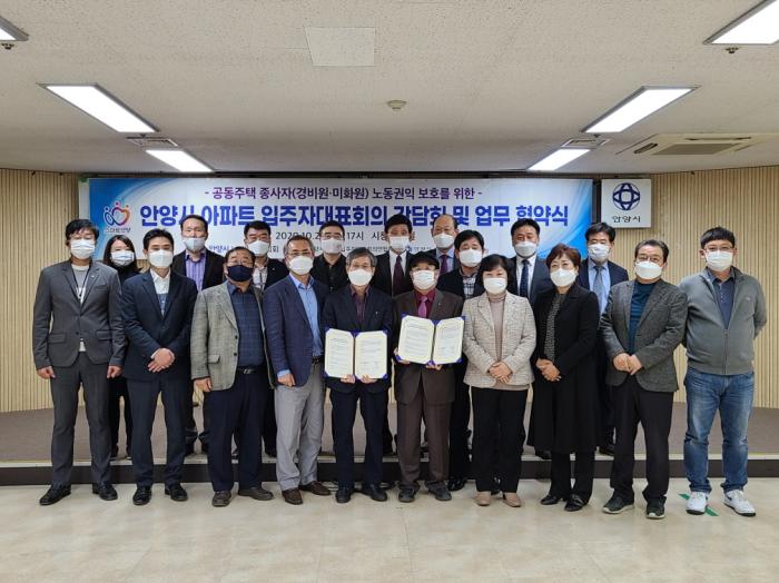 안양시노사민정협의회(위원장 최대호 안양시장/이하 노사민정협)가 주관한 이날 협약식은 관내 아파트입주민대표회연합회, 안양시와 고용노동부 관계관 등 20여명이 함께했다