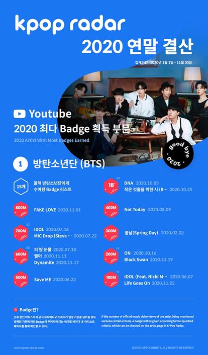 [뉴스시선집중, 최현숙기자] 케이팝 레이더가 지난 해에 이어 유튜브와 인스타그램, 트위터, 페이스북 등 케이팝 아티스 데이터를 총집합 한 ‘케이팝 레이더 2020 연말 결산’을 16일 발표했다.
