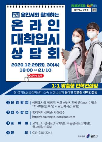 [뉴스시선집중, 이학범기자] 용인시는 16일 2021학년도 대입 정시모집에 대비해 29일부터 30일까지 온라인으로 진행되는 입시 컨설팅에 수험생과 학부모 등 참가자 240명을 모집한다고 밝혔다.