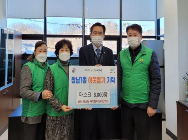 [뉴스시선집중, 박광옥기자] 광주시 광남동 새마을협의회(협의회장 권태완·김명숙)는 지난 16일 광남1동 행정복지센터를 방문, 코로나19로 어려움을 겪는 관내 취약계층을 위해 전달해 달라며 마스크 8천장을 기부했다.