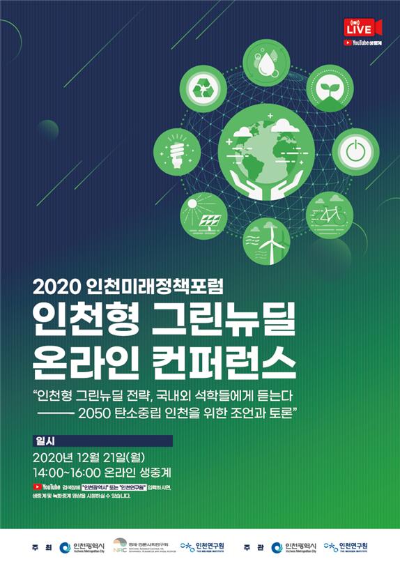 [뉴스시선집중, 박동혁기자] 인천광역시는 12월 21일 오후 2시, 경제?인문사회연구원, 인천연구원과 공동으로 <2020 인천미래정책포럼: 인천형 그린뉴딜 전략, 국내외 석학들에게 듣는다>를 개최한다고 밝혔다.