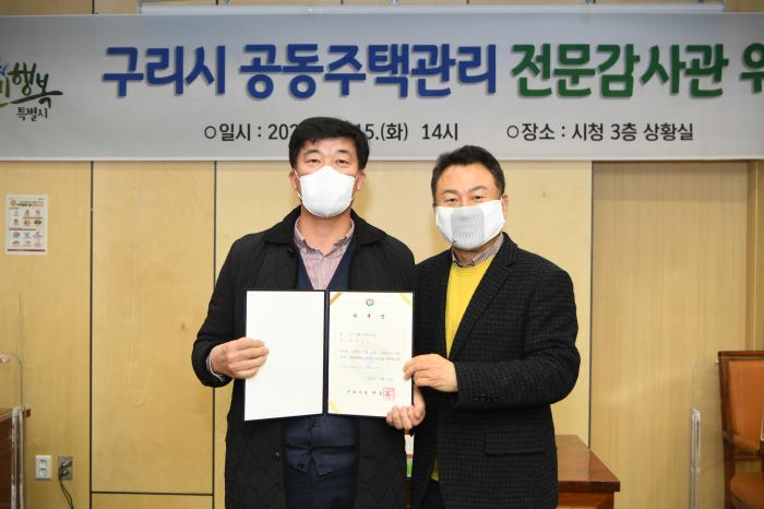 이번 위촉식은 구리시에서 공동주택관리 감사팀이 신설되고 공동주택 관리의 효율화와 입주자·사용자 등의 보호를 위한 투명하고 공정한 감사를 위하여 각계 분야별 전문성을 확보한 민간전문가를 공동주택관리 전문감사위원으로 변호사, 회계사, 건축사, 노무사, 주택관리사, 중앙공동주택 관리지원센터 소속직원 등 총 15명을 위촉하고 임기는 2년이다.