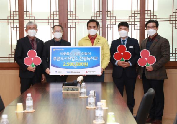 [뉴스시선집중, 김시훈기자] 평택시 푸른도시사업소 산림녹지과는 지난 17일 평택시청 대외협력실에서 지역사회 소외계층을 위해 이웃돕기 성금 250만원을 전달했다.