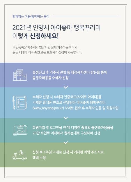 ‘아이좋아 행복꾸러미’는 아이를 출산한 가정에 대해 다양한 육아용품을 상자에 담아 전달, 아이 낳아 키우기 좋은 안양만들기의 일환이다.