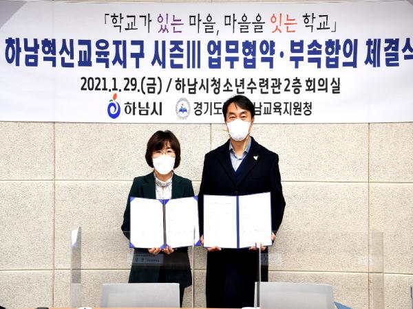 시는 지난 29일 하남시청소년수련관에서 김상호 시장과 한정숙 광주하남교육장이 참석한 가운데 경기도교육청과 서면 업무협약을 맺고, 광주하남교육청과는 세부사업 운영을 위한 부속합의서를 체결했다고 밝혔다.