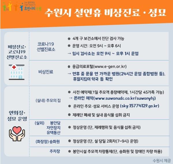 연휴 기간 내내 24시간 운영되는 수원시 내 종합병원 및 응급실은 장안구 경기도의료원 수원병원, 권선구 수여성병원·수원중앙병원, 팔달구 성빈센트병원·동수원병원·수병원, 영통구 아주대학교병원 등 7곳이다.