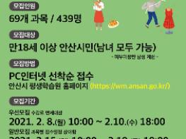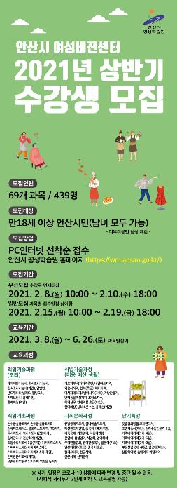 [뉴스시선집중, 김시훈기자] 안산시 여성비전센터에서는 오는 8일부터 19일까지 2021년도 상반기 교육 수강생을 모집한다고 3일 밝혔다.