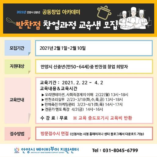 반찬전분 분야 창업아카데미 과정은 다음 달인 2월 22일부터 4월 2일까지 전문 강사진에 의해 안양시여성인력개발센터와 안양시일자리센터 교육장에서 진행될 예정이다.