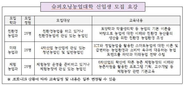 2021학년도 운영학과는 친환경농업과, 미래농업과, 체험농업과로 학과별 25명씩 총 75명의 신입생을 모집하며, 지원대상은 주민등록상 평택시에 주소를 둔 농업인 및 농업에 관심 있는 일반시민이면 누구나 지원이 가능하다.