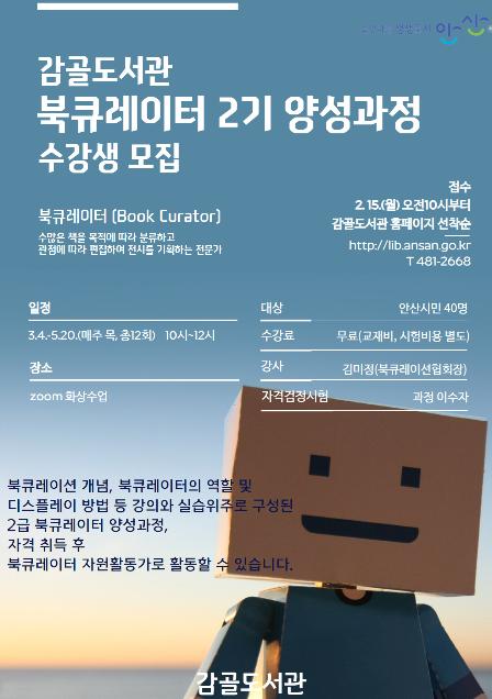 [뉴스시선집중, 김시훈기자] 안산시 감골도서관은 지역주민이 북큐레이터가 되어 직접 도서 선정 및 기획 전시를 할 수 있는 ‘북큐레이터 2급 전문가 양성과정’을 운영한다고 4일 밝혔다.
