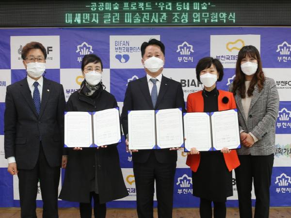 [뉴스시선집중, 박동혁기자] 부천시는 지난 4일 시청 만남실에서 공공미술 프로젝트 사업인 부천형 미세먼지 클린 미술전시관 조성을 위해 작가팀·초등학교와 업무 협약식을 체결했다.