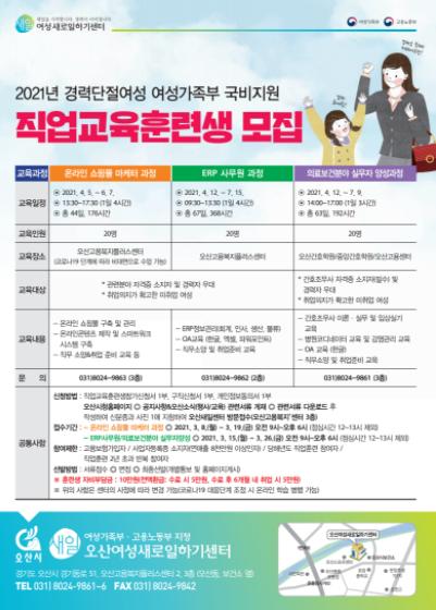 이번에 모집하는 직업교육훈련은 오산여성새로일하기센터에서 훈련계획을 수립하여 여성가족부의 공모사업을 통해 선정된 100% 국비 사업으로 교육비는 무료로 진행되며, 온라인쇼핑몰 마케터과정, ERP 사무원과정, 의료보건분야 실무자 양성과정 등 3개 과정이 진행될 예정이다.