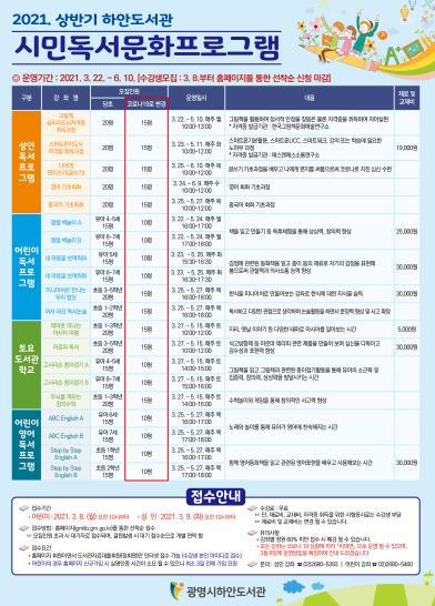성인대상 강좌는 ‘그림책 심리지도사 자격증 취득과정’ 등 평일 주간 5개 강좌가 운영되며, 어린이대상 평일 강좌는 ‘네 마음을 보여줘!’등 15개, 토요 강좌는‘테마로 떠나는 아시아 여행’ 등 5개, 영어 강좌는 ‘Let’s Go English‘등 4개 강좌가 운영된다.