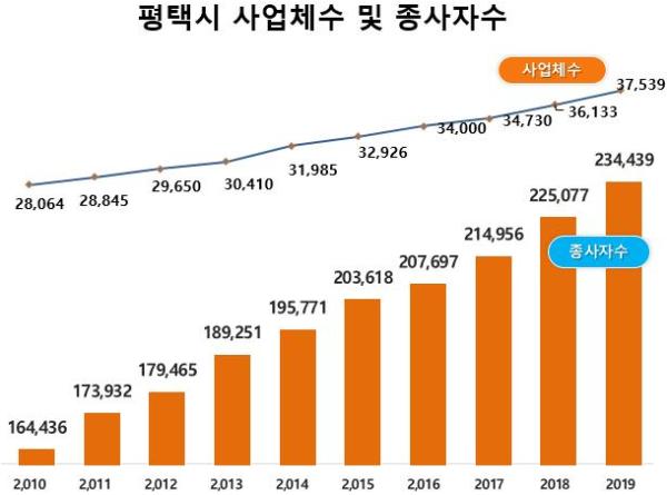 평택시 '2019년 기준 사업체조사' 결과에 따르면 평택시 내 사업체수는 37,539개, 종사자수는 234,439명으로 조사됐다. 이는 전년보다 사업체수는 1,406개(3.9%), 종사자수는 9,362명(4.2%)% 증가한 것이다.