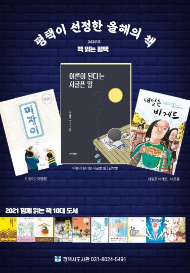 [뉴스시선집중, 김시훈기자] 평택시의 대표적인 시민독서운동인 '책 읽는 평택' 2021년 ‘올해의 책’이 선정됐다. ‘올해의 책’은 시민공모를 통해 추천된 122권의 도서를 대상으로 시민 도서선정준비단의 3차례 회의를 거쳐 '어른이 된다는 서글픈 일/김보통 지음, 한겨레출판', 내일은 바게트/이은용 지음, 문학과지성사, 미장이/이명환 지음, 한솔수북 등 3권을 확정지었다.